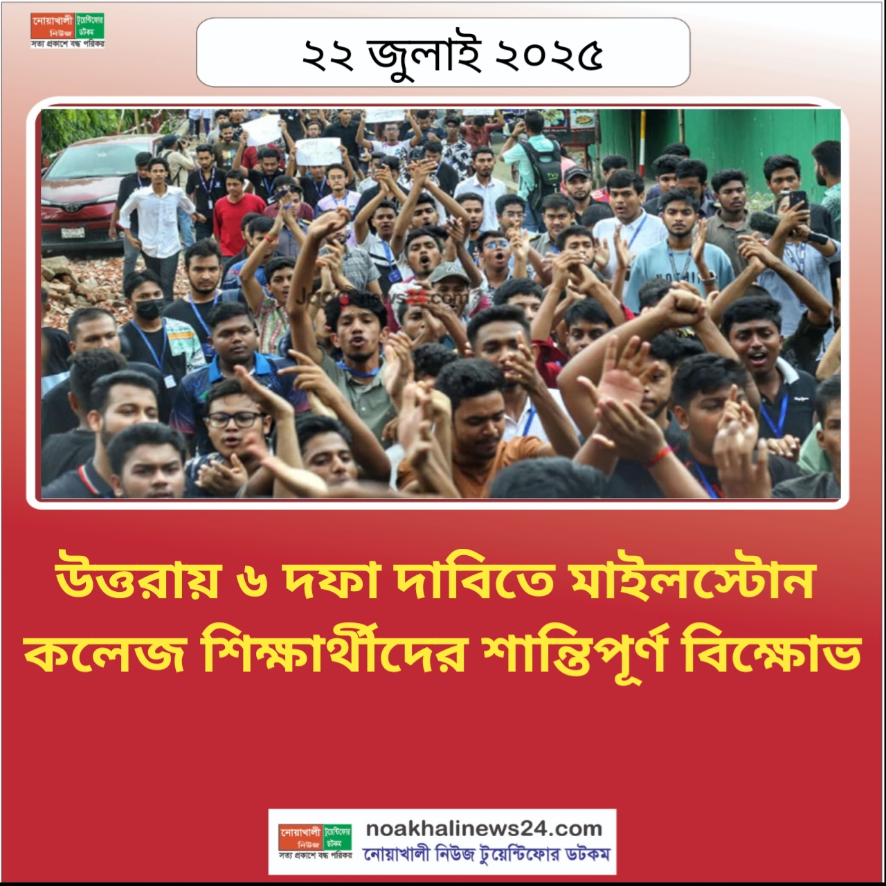 রাজধানীর উত্তরায় মাইলস্টোন স্কুল অ্যান্ড কলেজে বিমানবাহিনীর প্রশিক্ষণ যুদ্ধবিমান বিধ্বস্ত হয়ে প্রাণহানির ঘটনায় শিক্ষার্থী ও অভিভাবকদের মধ্যে তীব্র ক্ষোভ ও উদ্বেগ বিরাজ করছে। এই ঘটনায় মঙ্গলবার (২২ জুলাই) কলেজের গোল চত্বরে শান্তিপূর্ণ আন্দোলনের ডাক দিয়েছে শিক্ষার্থীরা।